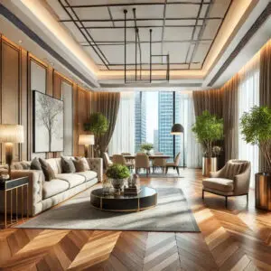 ” Một không gian phòng khách sang trọng với sàn gỗ cao cấp. “