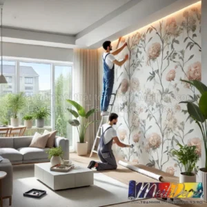 ” Thi công tranh dán tường hoa lá tinh tế trong phòng khách rộng rãi. ”