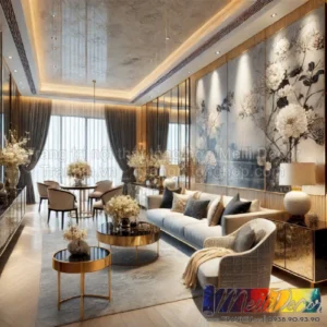 ” Không gian phòng khách sang trọng với tranh dán tường hoa văn nghệ thuật. “