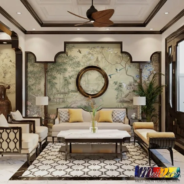 Phong cách Indochine (Đông Dương) không còn xa lạ trong thiết kế nội thất hiện đại tại Việt Nam. Khi đưa vào tranh dán tường phòng khách, phong cách này phát huy tối đa giá trị thẩm mỹ và chiều sâu văn hóa.