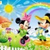 Hình ảnh Doraemon tung tăng bên Nobita, Shizuka, Chaien và Suneo giữa khung cảnh sắc màu – bầu trời xanh trong, cánh đồng hoa nở rộ, những ngôi nhà nhỏ xinh… như đưa bé bước vào thế giới hoạt hình sống động đầy niềm vui. ☁️🌻🏡