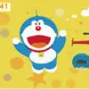 • Doraemon với nụ cười hiền hòa, tay cầm chong chóng tre bay lượn trên bầu trời.