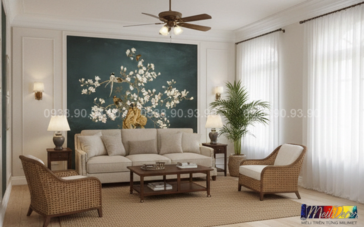 Meili Decor chuyên thi công tranh dán tường Indochine tại TP.HCM và các tỉnh lân cận, nhận in tranh theo kích thước thực tế, phù hợp cho nhà phố, căn hộ, nhà hàng, quán cafe, spa và nhiều không gian khác.