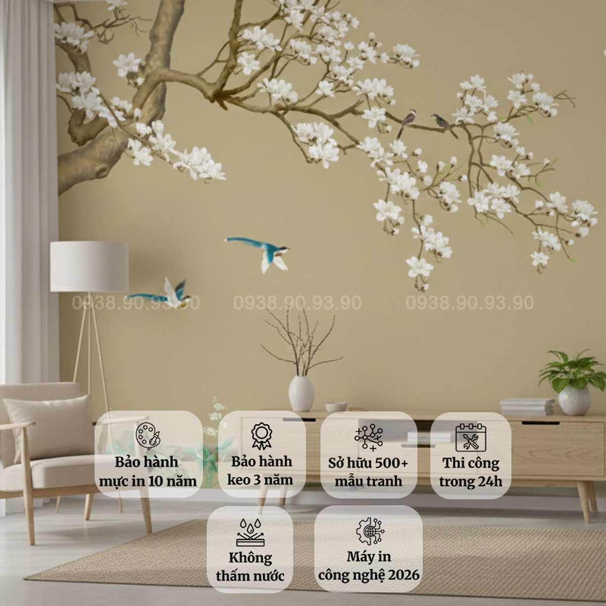Kích thước: In theo kích thước thực tế, phù hợp từng mảng tường
