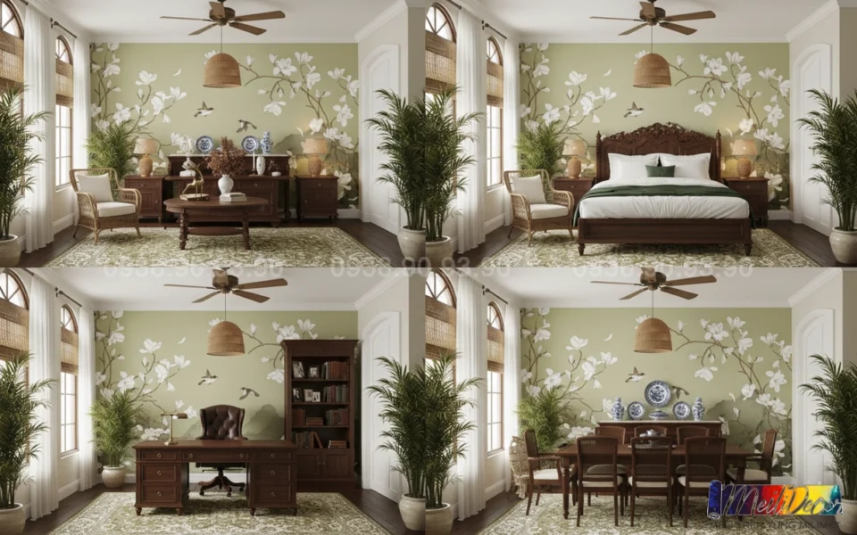 Meili Decor chuyên thi công tranh dán tường Indochine tại TP.HCM và các tỉnh lân cận, nhận in tranh theo kích thước thực tế, phù hợp cho nhà phố, căn hộ, nhà hàng, quán cafe, spa và nhiều không gian khác.