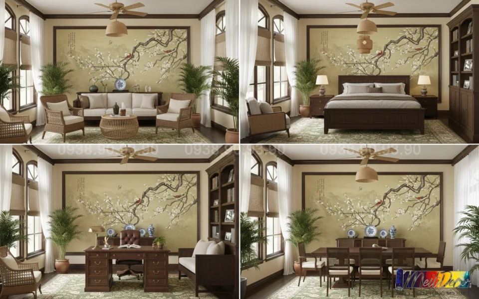 Tranh Indochine ML81064 là mẫu tranh dán tường mang phong cách Đông Dương được tiết chế tinh tế, phù hợp với nhiều kiểu không gian khác nhau. Thiết kế tập trung vào sự hài hòa tổng thể, giúp mảng tường trở nên nổi bật vừa đủ mà không làm mất đi sự cân bằng của nội thất xung quanh.