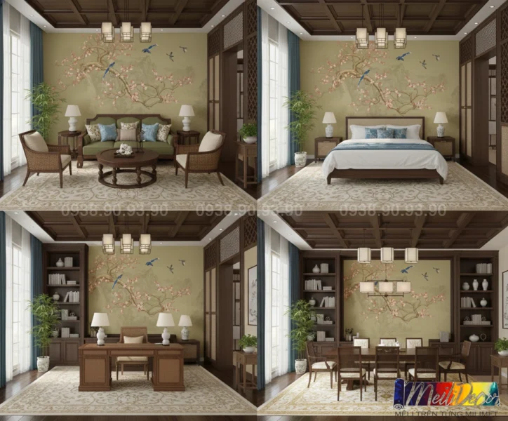 Meili Decor chuyên thi công tranh dán tường Indochine tại TP.HCM và các tỉnh lân cận, nhận in tranh theo kích thước thực tế, phù hợp cho nhà phố, căn hộ, nhà hàng, quán cafe, spa và nhiều không gian khác.