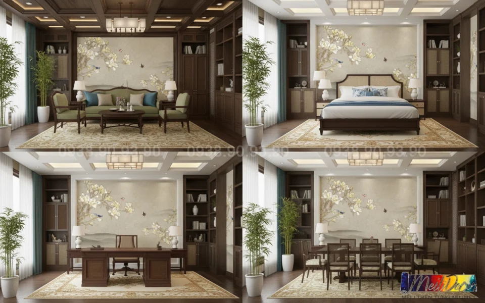 Meili Decor chuyên thi công tranh dán tường Indochine tại TP.HCM và các tỉnh lân cận, nhận in tranh theo kích thước thực tế, phù hợp cho nhà phố, căn hộ, nhà hàng, quán cafe, spa và nhiều không gian khác.