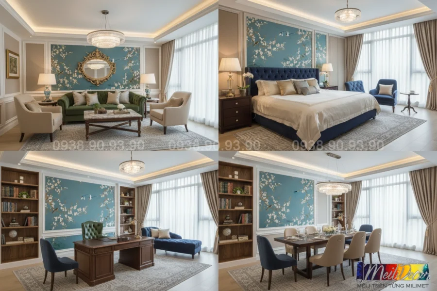 Meili Decor chuyên thi công tranh dán tường Indochine tại TP.HCM và các tỉnh lân cận, nhận in tranh theo kích thước thực tế, phù hợp cho nhà phố, căn hộ, nhà hàng, quán cafe, spa và nhiều không gian khác.