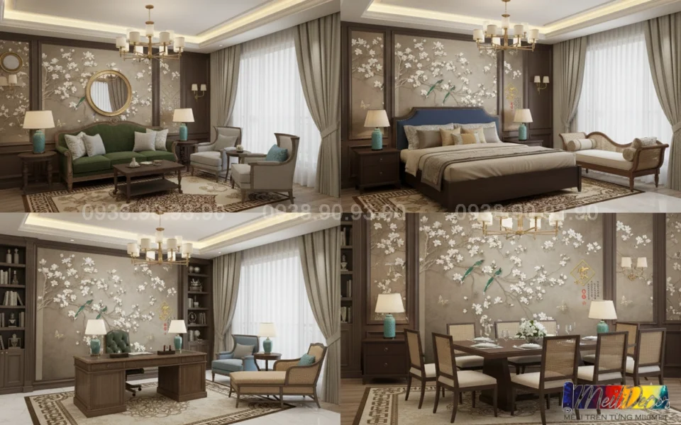 Meili Decor chuyên thi công tranh dán tường Indochine tại TP.HCM và các tỉnh lân cận, nhận in tranh theo kích thước thực tế, phù hợp cho nhà phố, căn hộ, nhà hàng, quán cafe, spa và nhiều không gian khác.