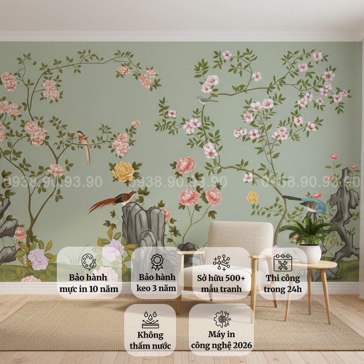 Kích thước: Nhận in theo kích thước thực tế từng mảng tường