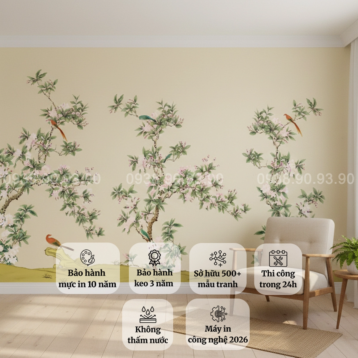 • Kích thước: In theo kích thước thực tế từng mảng tường