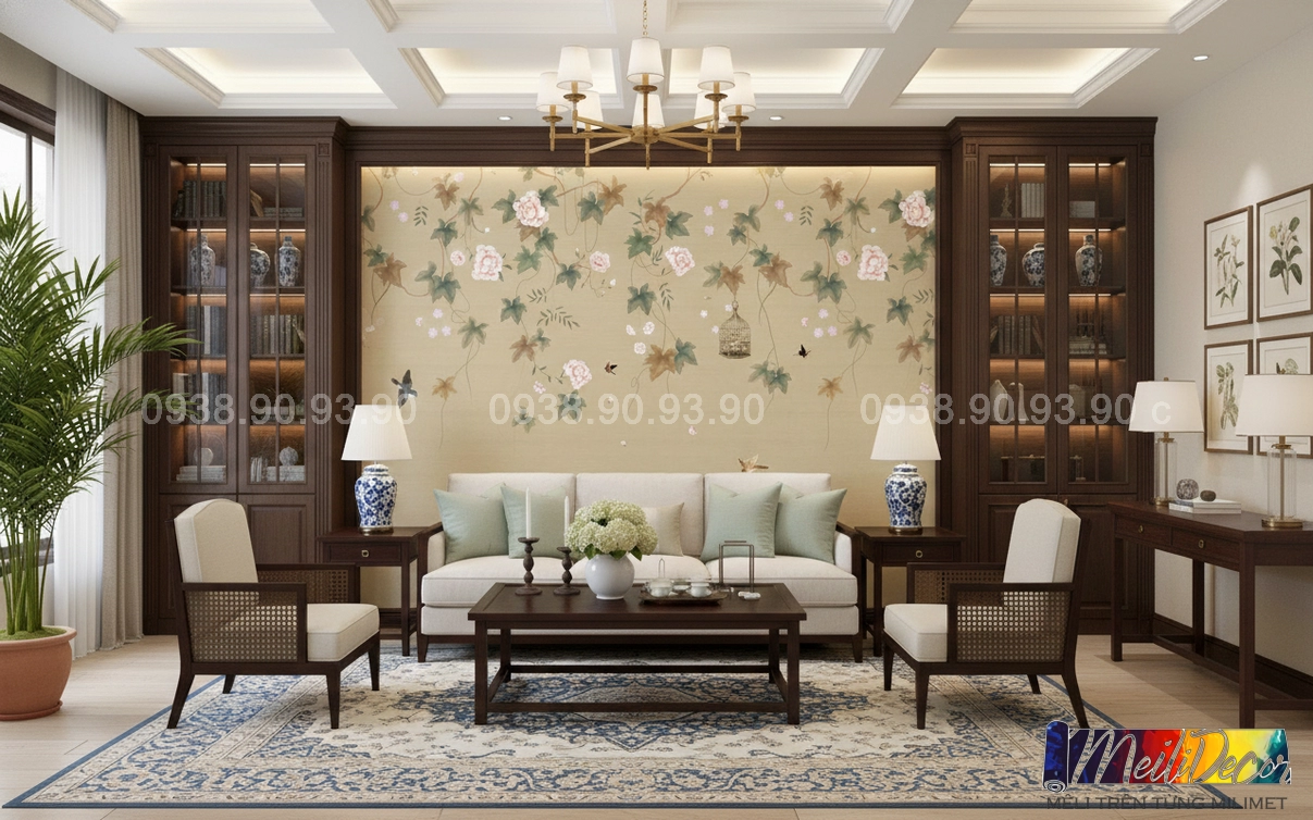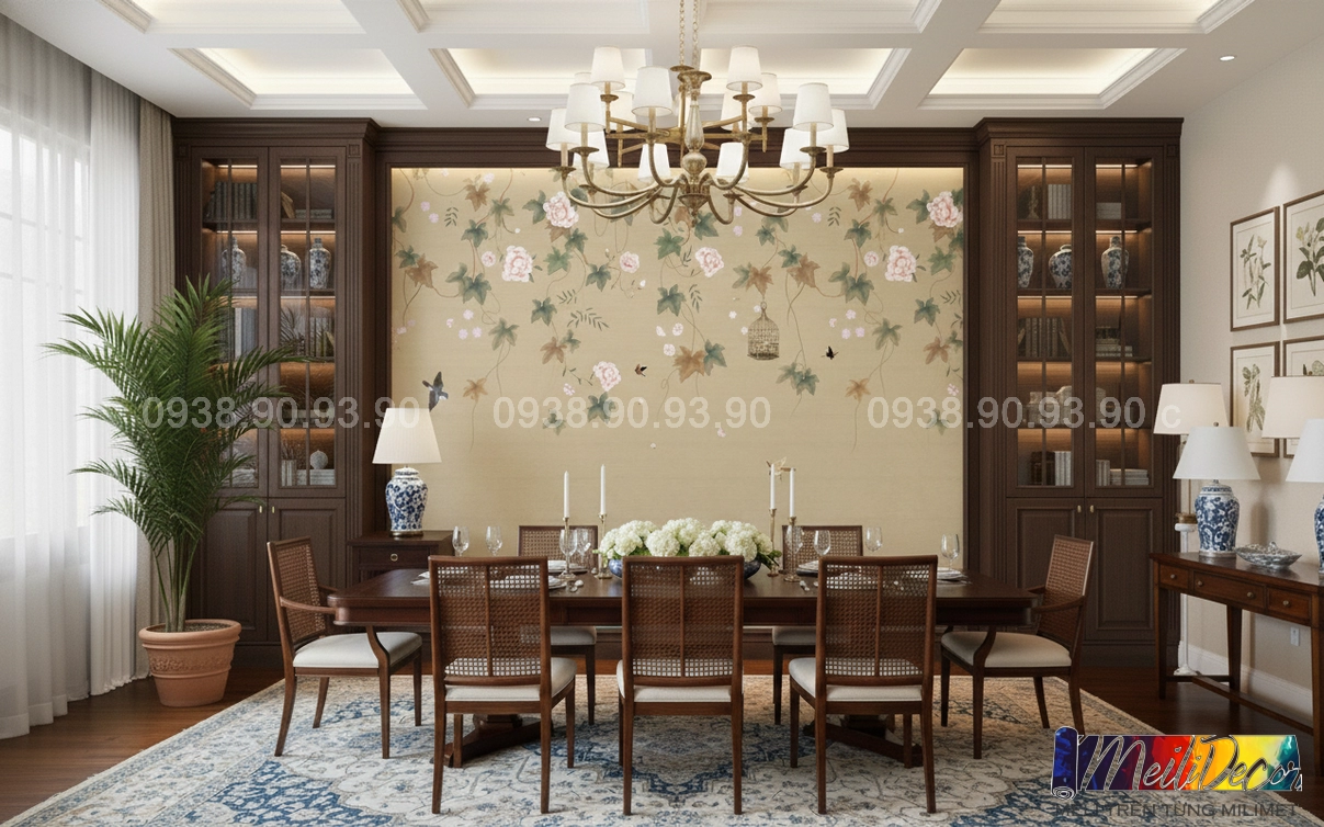 Meili Decor chuyên thi công tranh dán tường Indochine tại TP.HCM và các tỉnh lân cận, nhận in tranh theo kích thước thực tế, phù hợp cho nhà phố, căn hộ, nhà hàng, quán cafe, spa và nhiều không gian khác.