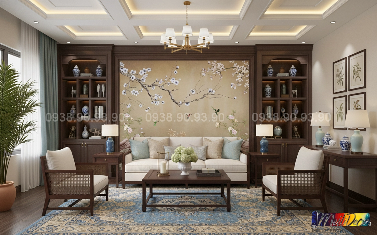 Meili Decor chuyên thi công tranh dán tường Indochine tại TP.HCM và các tỉnh lân cận, nhận in tranh theo kích thước thực tế, phù hợp cho nhà phố, căn hộ, nhà hàng, quán cafe, spa và nhiều không gian khác.