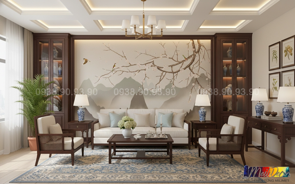 Meili Decor chuyên thi công tranh dán tường Indochine tại TP.HCM và các tỉnh lân cận, nhận in tranh theo kích thước thực tế, phù hợp cho nhà phố, căn hộ, nhà hàng, quán cafe, spa và nhiều không gian khác.