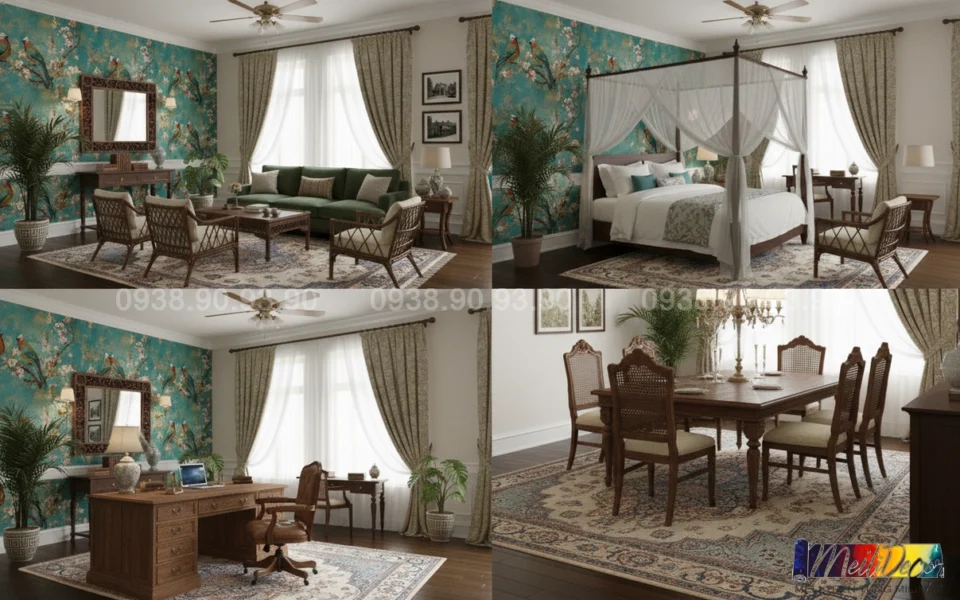 Meili Decor chuyên thi công tranh dán tường Indochine tại TP.HCM và các tỉnh lân cận, nhận in tranh theo kích thước thực tế, phù hợp cho nhà phố, căn hộ, nhà hàng, quán cafe, spa và nhiều không gian khác.
