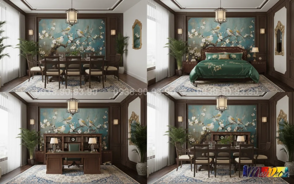 Meili Decor chuyên thi công tranh dán tường Indochine tại TP.HCM và các tỉnh lân cận, nhận in theo kích thước thực tế, phù hợp cho nhà phố, căn hộ, nhà hàng, quán cafe, spa và nhiều không gian khác.
