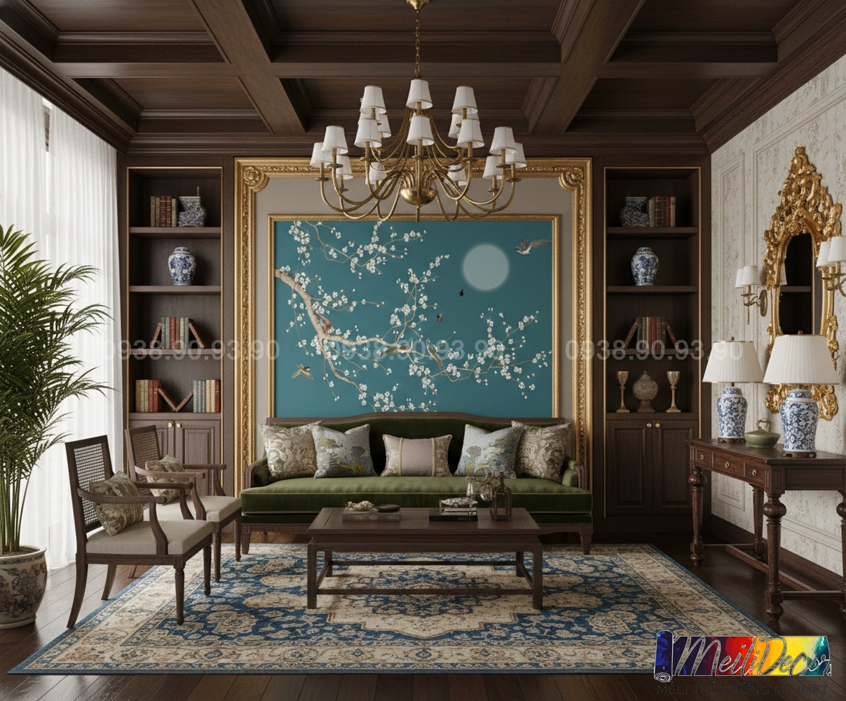 Meili Decor chuyên thi công tranh dán tường Indochine tại TP.HCM và các tỉnh lân cận, nhận in tranh theo kích thước thực tế, phù hợp cho nhà phố, căn hộ, nhà hàng, quán cafe, spa và nhiều không gian khác.