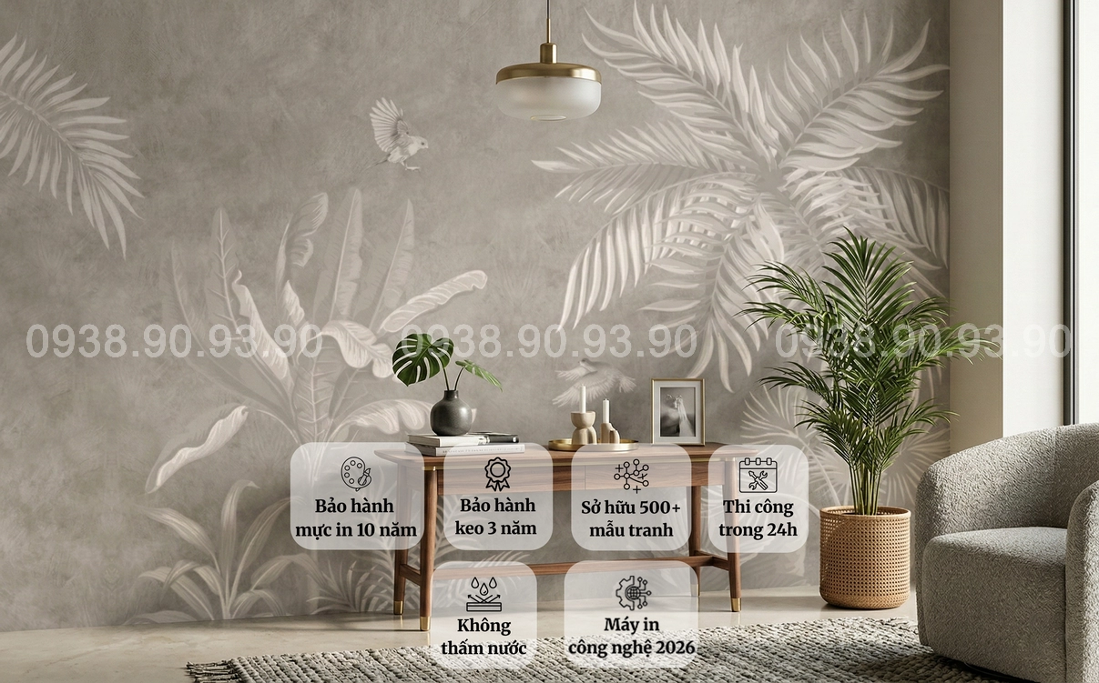 Sản phẩm được in bằng mực UV hoặc mực dầu cao cấp, đảm bảo màu sắc sắc nét và bền theo thời gian. Khách hàng có thể chọn chất liệu PP cao cấp hoặc canvas tùy nhu cầu. Tranh được in theo kích thước thực tế, đảm bảo vừa vặn và chuẩn bố cục khi thi công.