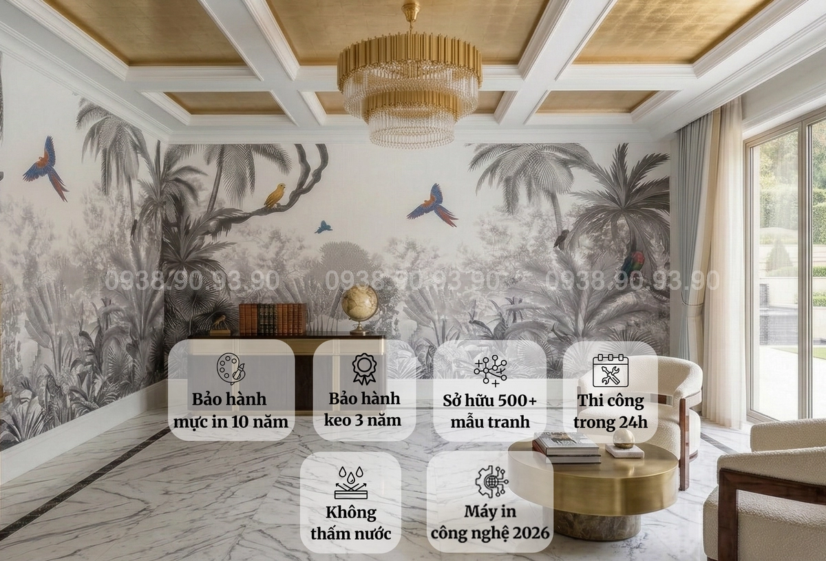 Tranh được in theo kích thước thực tế của mảng tường, giúp bố cục hình ảnh cân đối và thuận tiện trong quá trình thi công.