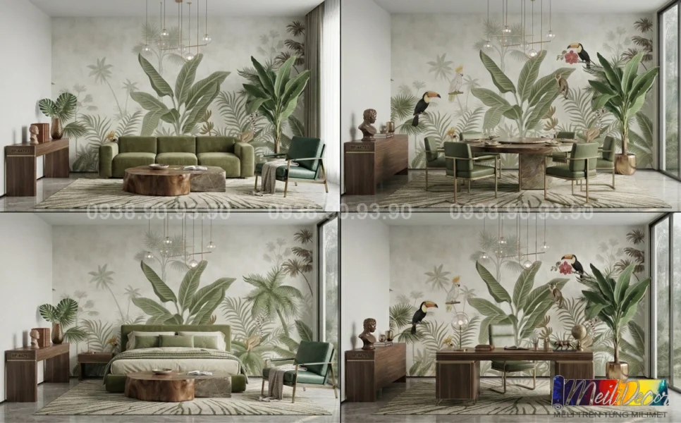 Meili Decor chuyên thi công tranh dán tường Indochine tại TP.HCM và các tỉnh lân cận, nhận in theo kích thước thực tế cho nhà phố, căn hộ, nhà hàng, quán cafe, spa và nhiều không gian khác.